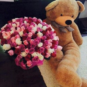 When one hundred reasons to say “I love you” simply aren’t enough, this show-stopping bundle delivers. The rainbow of rose colors symbolizes every hue of your relationship, and the giant teddy bear makes it a memory that lasts far beyond the big day.
